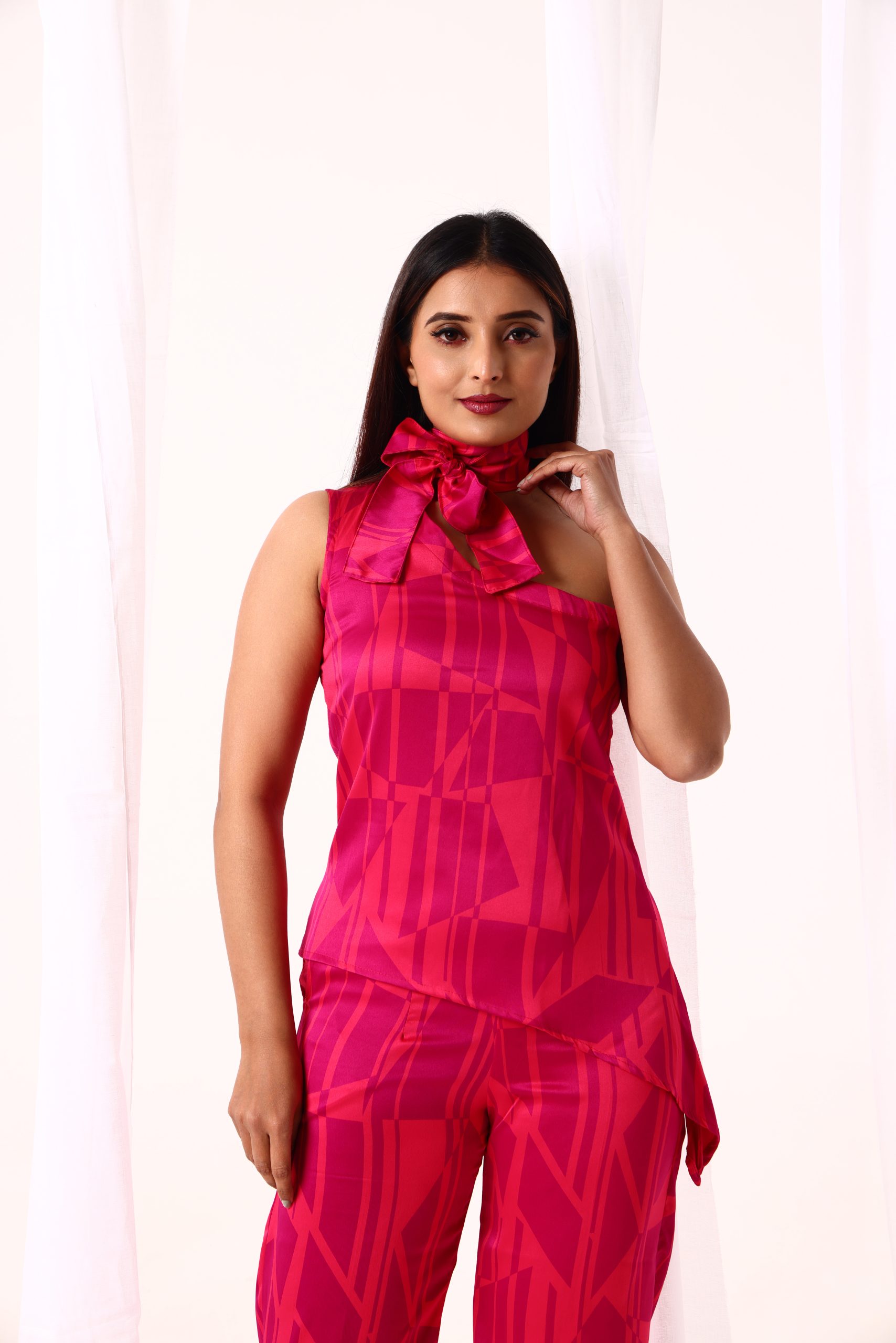 Savor the pinnacle of elegance with this one-shoulder satin coord set, which is sure to turn heads wherever you go. This outfit, which is made of opulent satin fabric, is exquisite and charming, making it ideal for special events when you want to leave a lasting impression.